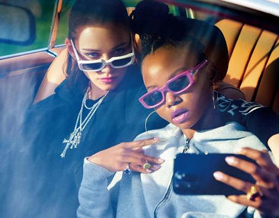今季注目したいのが、スクエア型のサングラス。ホワイトやパープルといったポップなカラーリングが目を引きつつ、テンプルに施されたアイコンモチーフがクロムハーツらしい存在感を添える。